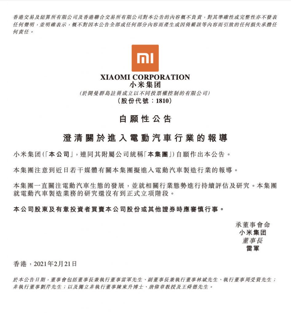 昨日,小米集团在港交所发布公告:“本集团注意到近来若干媒体有关集团拟进入电动轿车制作职业的报道。集团一向重视电动轿车生态的开展,并就相关职业态势进行持续评价及研讨。本集团就电动轿车制作事务的研讨还没有到正式立项阶段。”可见小米关于造车现已心动不过还在犹疑之中。
