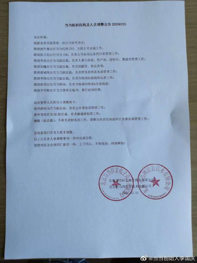 ,称拟提请董事会,同意其辞去当当 CEO 职务,并提请董事会,推举原当当高档副总姚丹骞出任 CEO,自己将仅保存当当董事长一职。李国庆公开信全文: